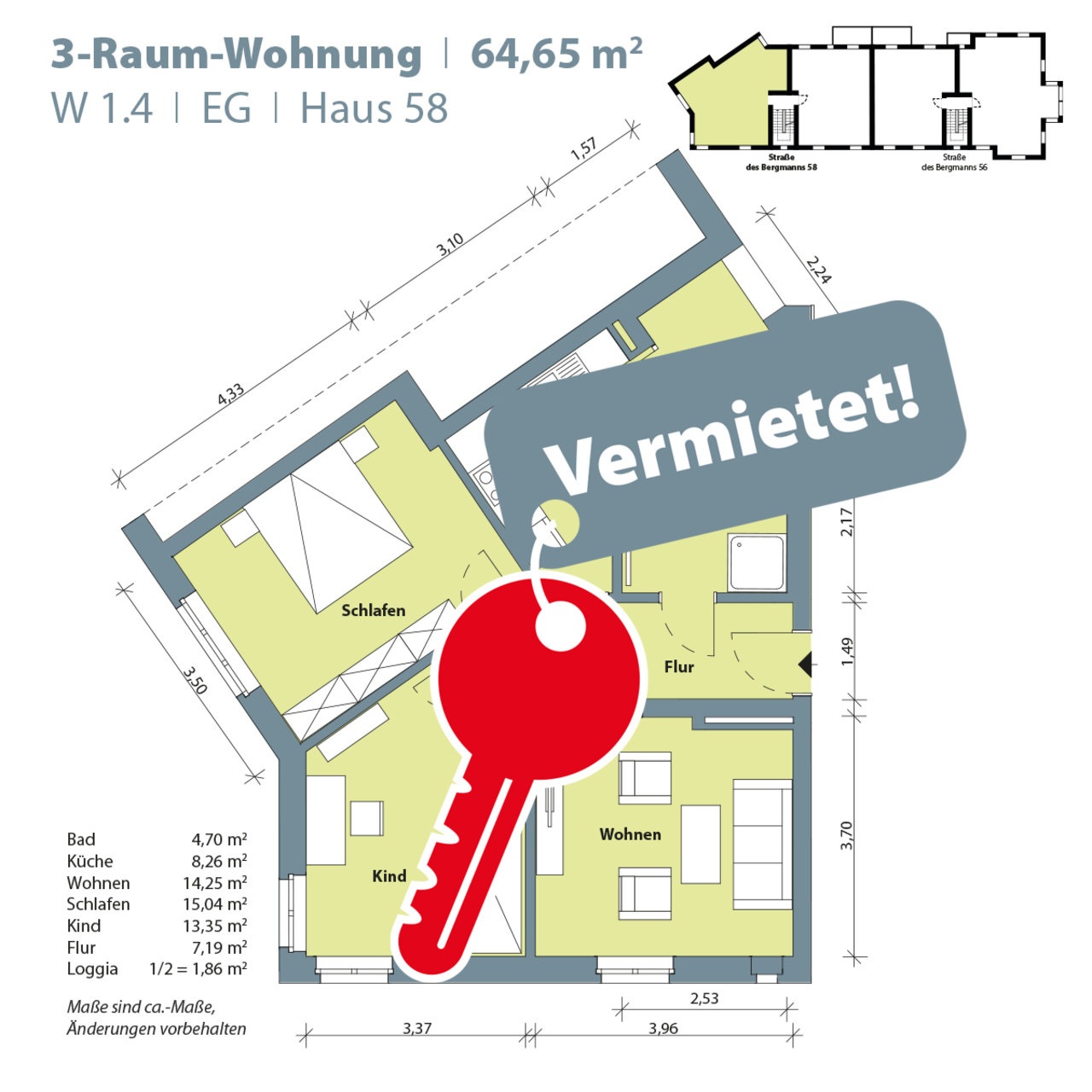 Wohnung 1.4, 3-Raum-Wohnung, 64,65 m2, vermietet