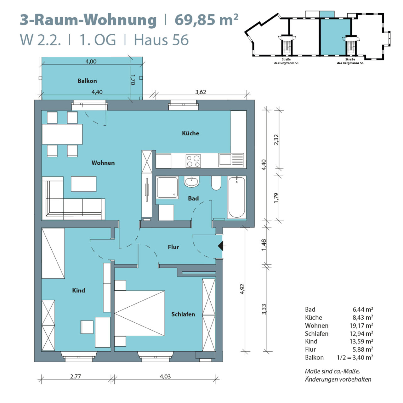 Wohnung 2.2, 3-Raum-Wohnung, 69,85 m2, 890,00 €