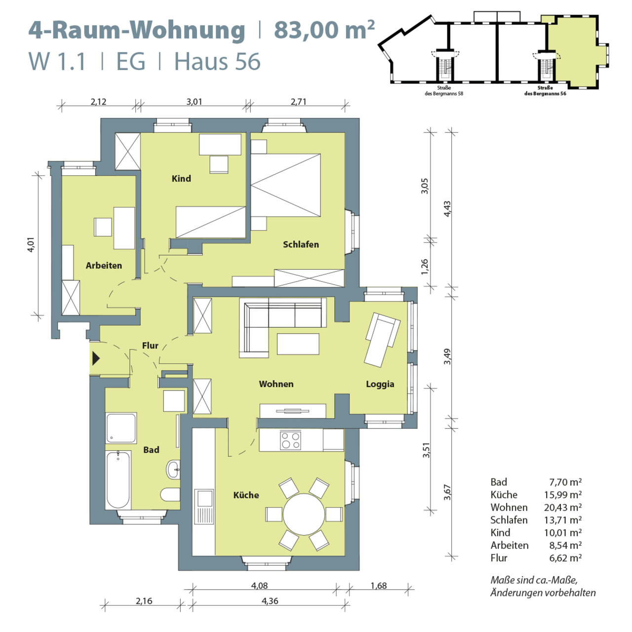 Wohnung 1.1, 4-Raum-Wohnung, 83,00 m2, 1.055,00 €