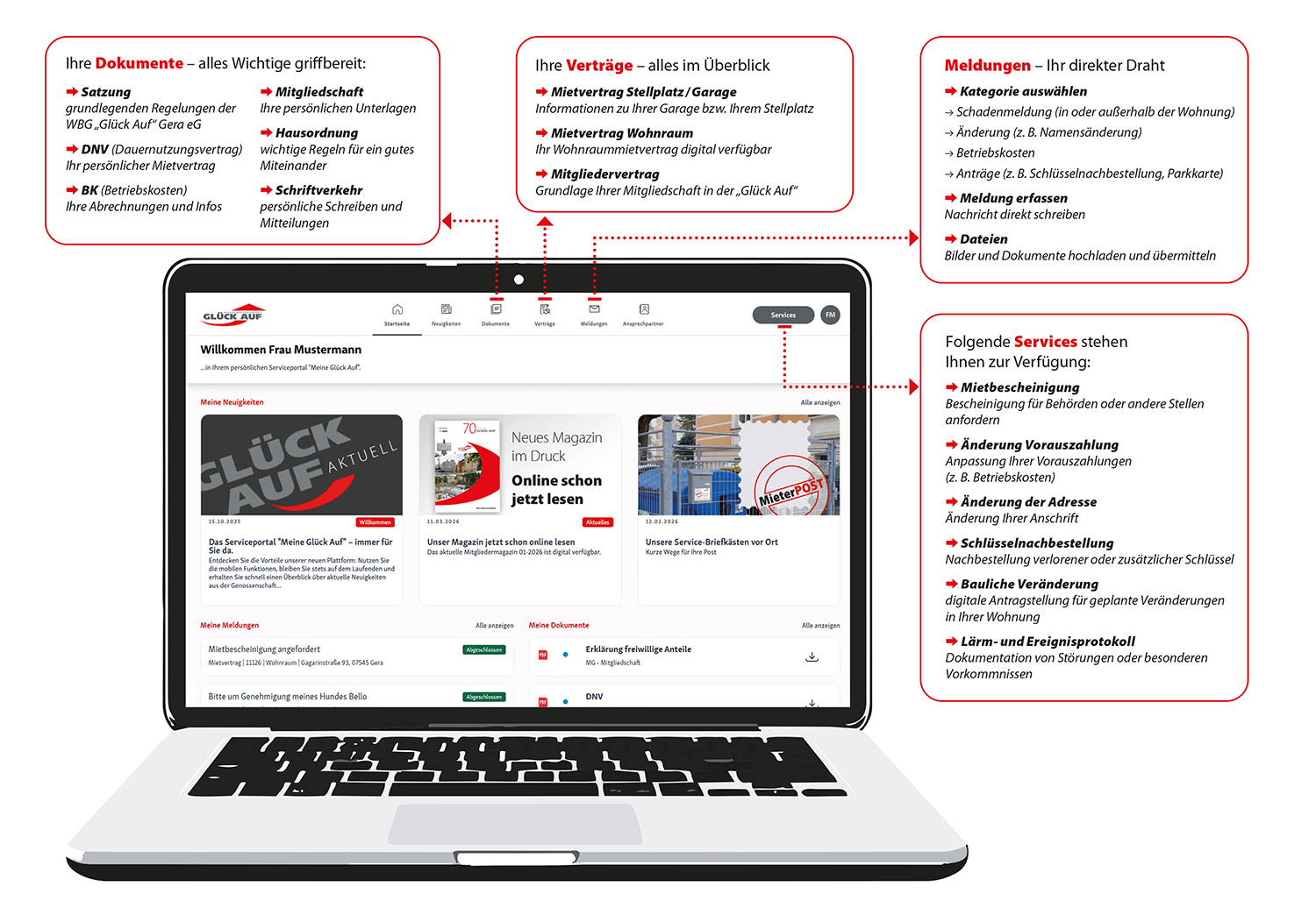 Mit Meine Glück Auf bieten wir Ihnen unseren digitalen Service rund um Ihre Mitgliedschaft. Ob Sie eine Wohnung bei uns nutzen oder Anteile an der Genossenschaft halten – hier haben Sie alles jederzeit im Blick: Betriebskostenabrechnungen, Schadenmeldungen, Dokumente, Mitteilungen oder wichtige Informationen.