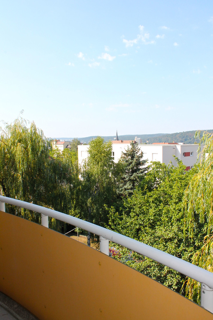 Vom Wohnzimmer aus gelangen Sie auf den geräumigen Balkon mit einem schönen Blick ins Grüne.