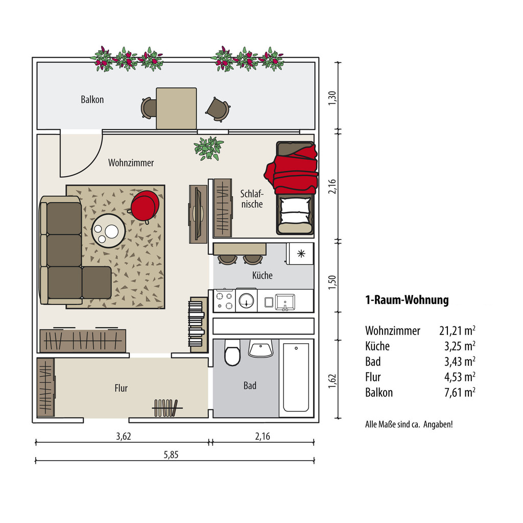 Diese gemütliche 1-Raum-Wohnung mit einem großen Balkon und dem tollen Ausblick wird gerade für Sie saniert. Das Bad wird mit einer bodengleichen Dusche sowie modernen großformatigen Fliesen ausgestattet. In allen Räumen wird ein hochwertiger Vinyl-Design-Fußbodenbelag verlegt.