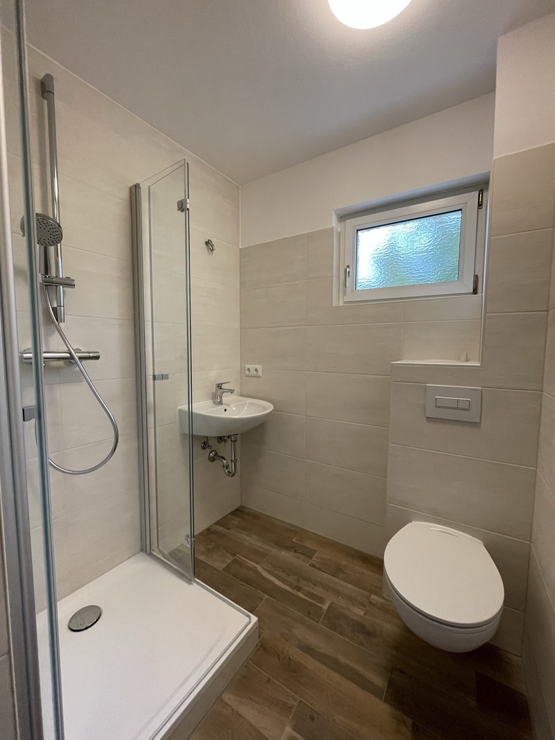 Das Tageslichtbad wurde mit einer Dusche sowie mit modernen großformatigen Fliesen ausgestattet. Alle Innentüren wurden erneuert.