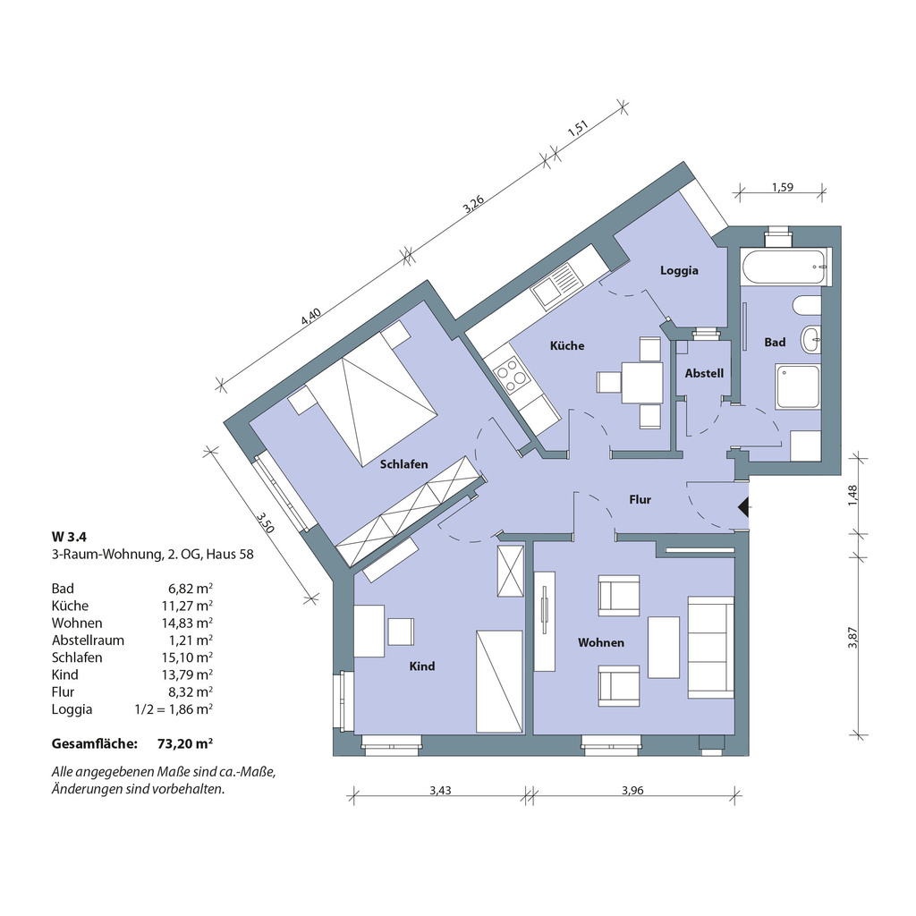 Diese 3-Raum-Wohnung entsteht im 2. Obergeschoss des Wohnhauses. Im großen Bad werden eine bodengleichen Dusche, eine Badewanne und moderne großformatige Fliesen eingebaut. Vom der Küche gelangen Sie in die lichtdurchflutete Loggia. Alle Räume werden mit einem hochwertigen Vinyl-Design-Fußbodenbelag und neuen Innentüren ausgestattet. Genügend Stauraum finden Sie außerdem in Ihrem eigenen Keller- und Dachbodenabteil sowie im Abstellraum in der Wohnung.