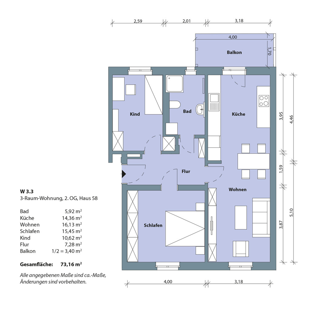 Diese 3-Raum-Wohnung entsteht im 2. Obergeschoss des Wohnhauses. Im großen Bad werden eine bodengleichen Dusche und moderne großformatige Fliesen eingebaut. Vom offen gestalteten Wohn- und Kochbereich gelangen Sie auf den großen Balkon. Alle Räume werden mit einem hochwertigen Vinyl-Design-Fußbodenbelag und neuen Innentüren ausgestattet. Genügend Stauraum finden Sie außerdem in Ihrem eigenen Keller- und Dachbodenabteil.
